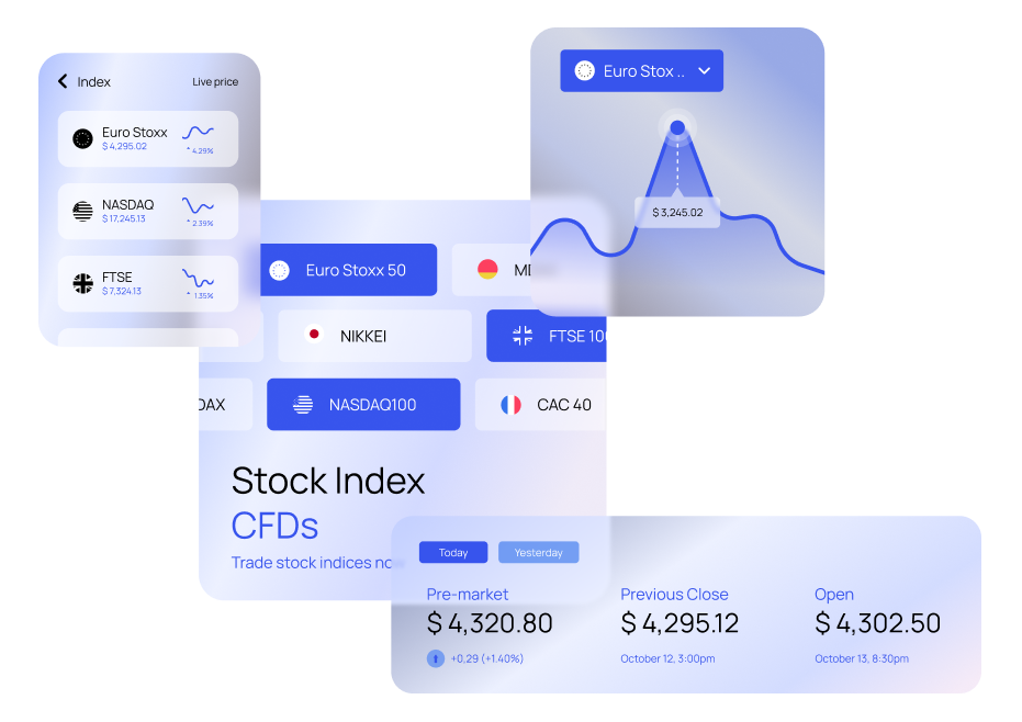Los índices bursátiles miden el desempeño de los precios de los mercados bursátiles. Puede comprar y vender CFDs sobre los principales índices mundiales así como acciones individuales. Con Traze, puede aprovechar a su favor los amplios movimientos en los mercados bursátiles de las bolsas financieras más grandes del mundo.